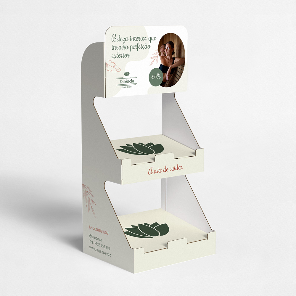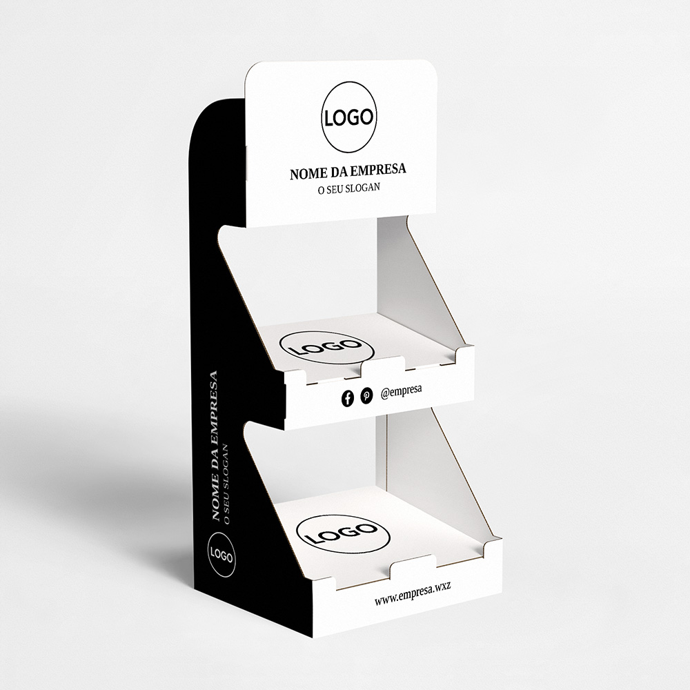 Explore diferentes estilos e modelos de expositor de balcão com 2 prateleiras. Escolha o design que melhor representa o seu negócio e personalize-o facilmente no nosso editor de design online.