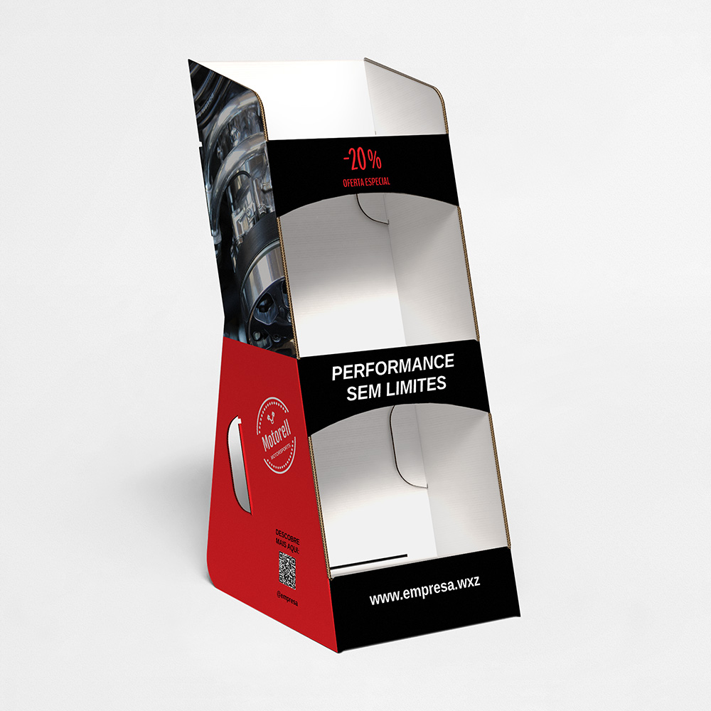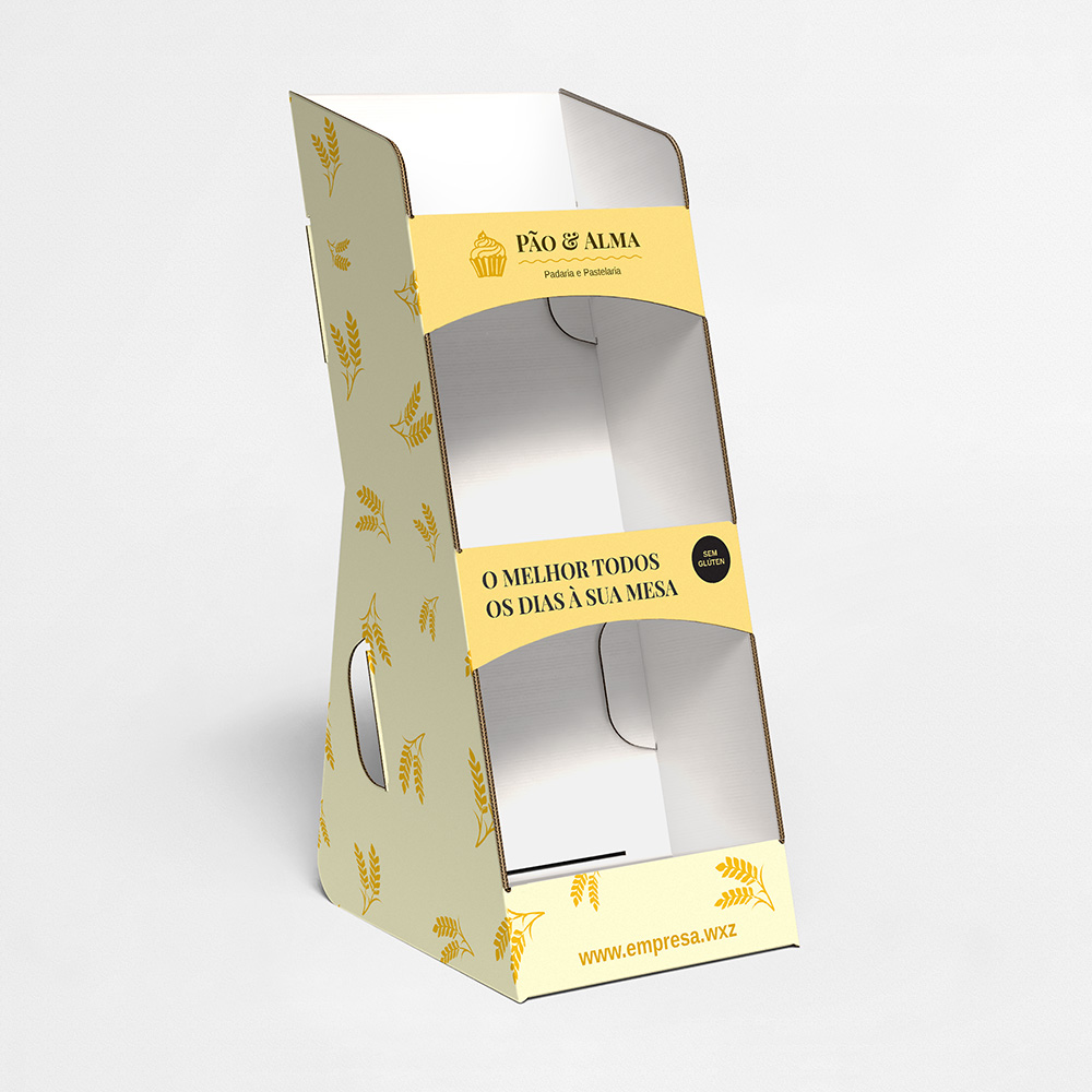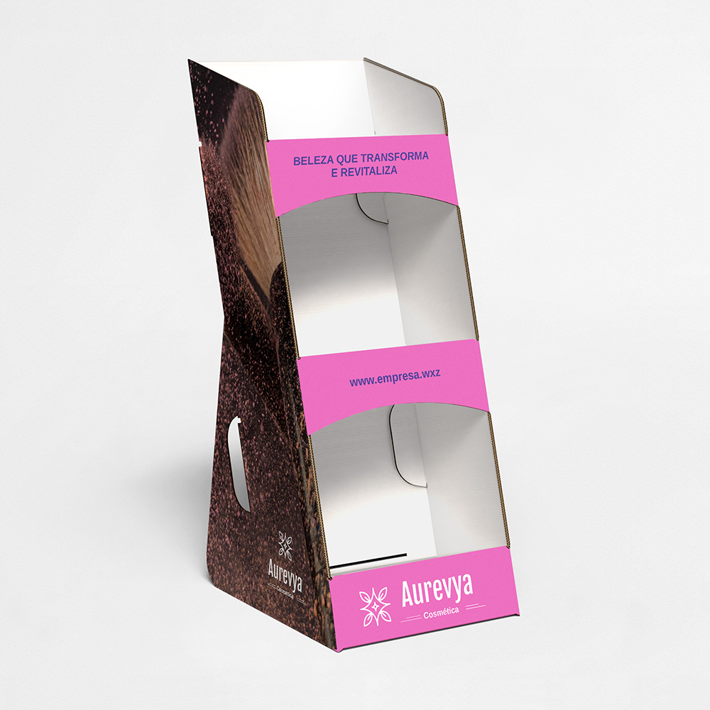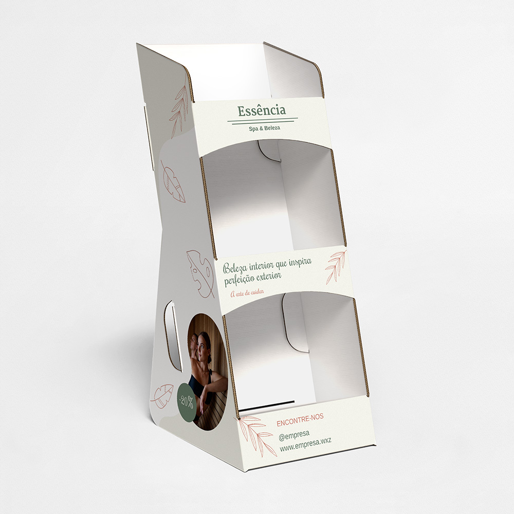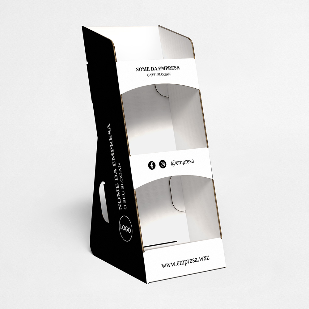 Explore diferentes estilos e modelos de expositor de balcão com 3 prateleiras. Escolha o design que melhor representa o seu negócio e personalize-o facilmente no nosso editor de design online.