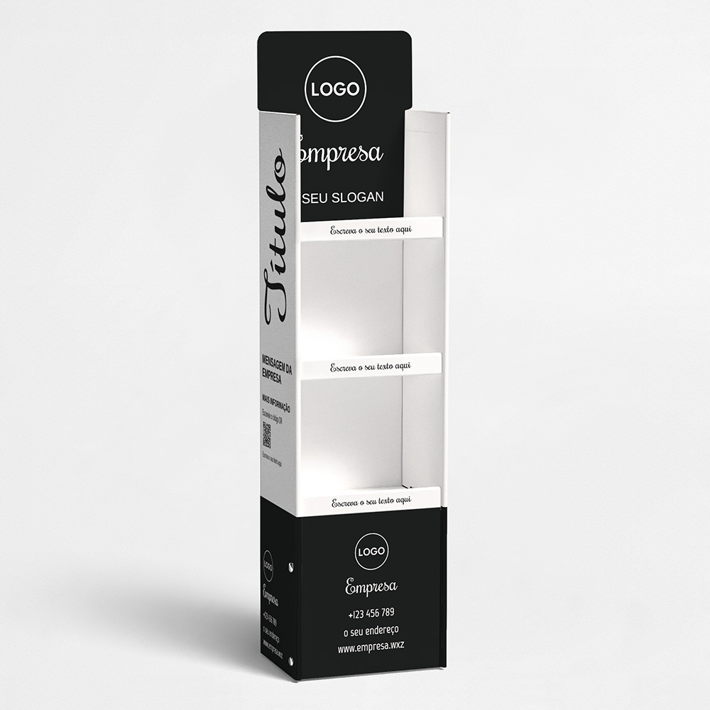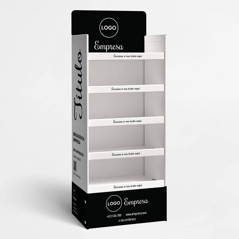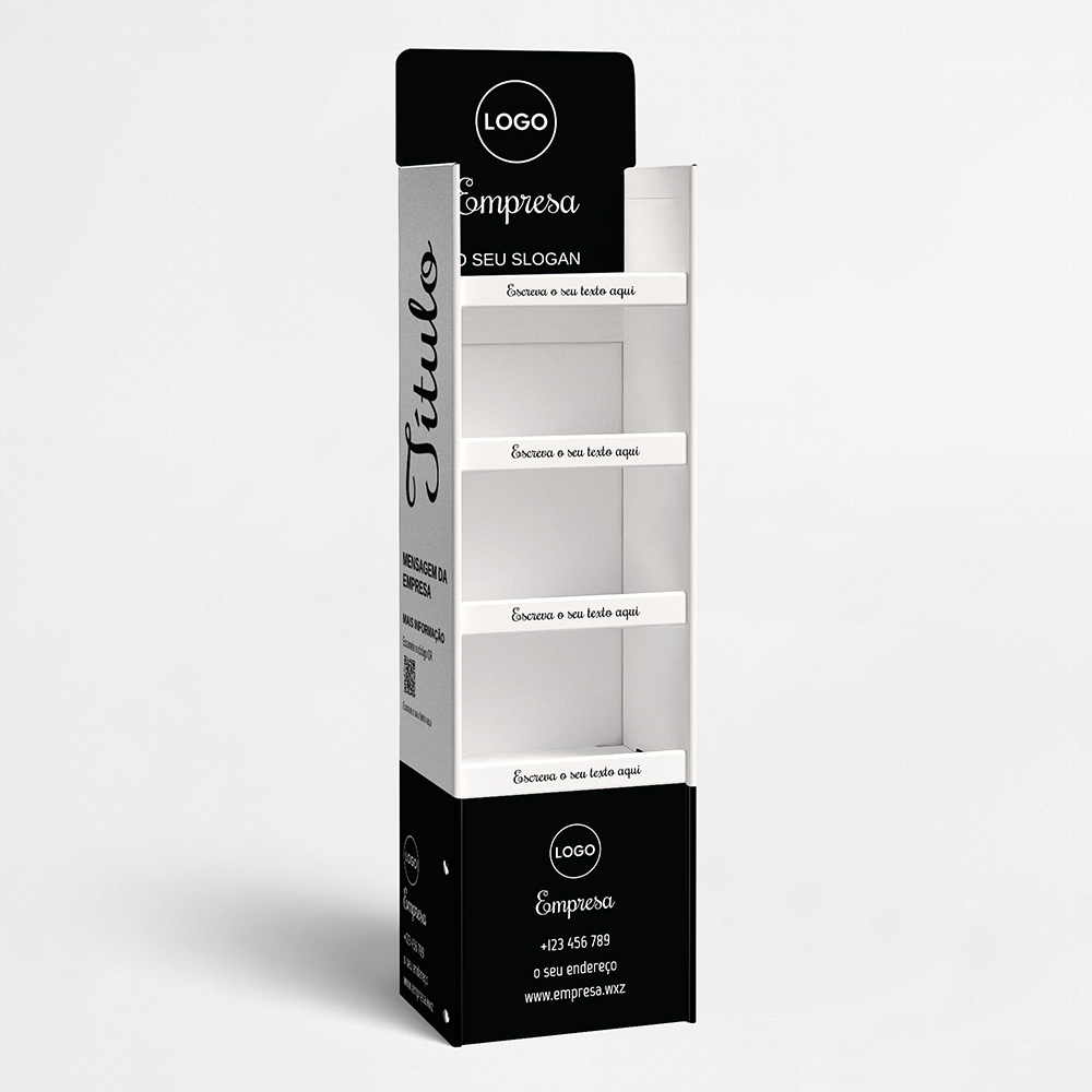 Explore diferentes estilos e modelos de expositores para produtos. Escolha o design que melhor representa o seu negócio e personalize-o facilmente no nosso editor de design online.