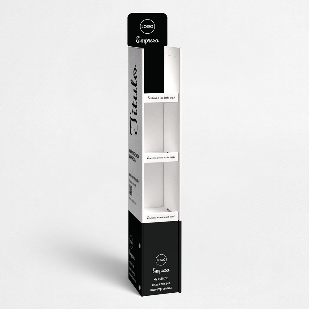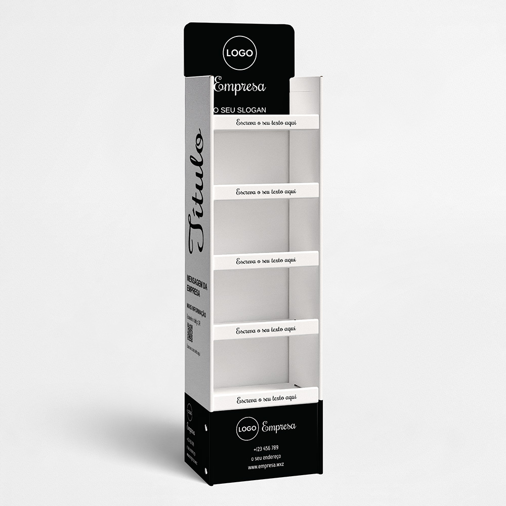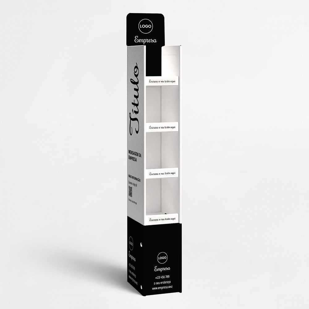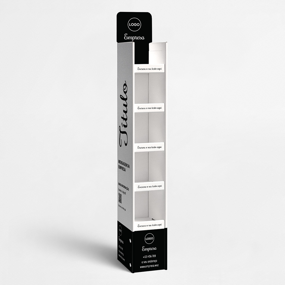 Explore diferentes estilos e modelos de expositores para produtos. Escolha o design que melhor representa o seu negócio e personalize-o facilmente no nosso editor de design online.