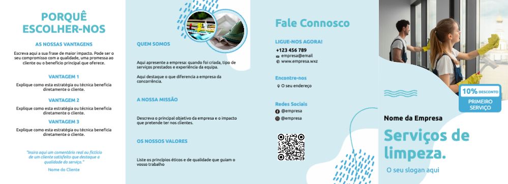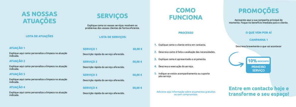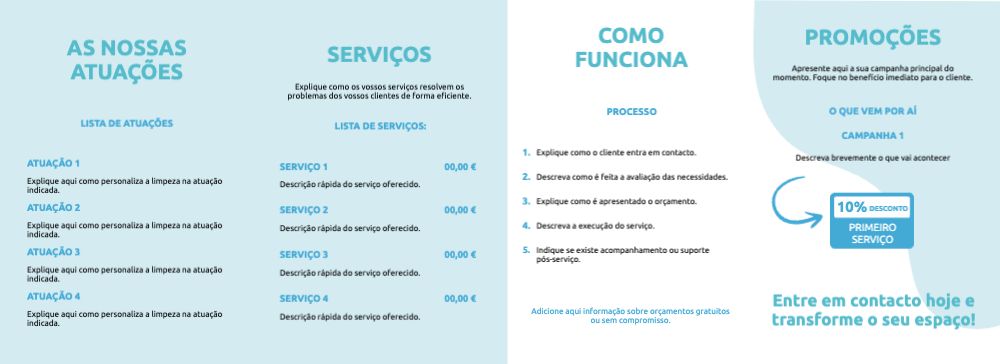 Explore diferentes estilos e modelos de folheto com 3 dobras em u. Escolha o design que melhor representa o seu negócio e personalize-o facilmente no nosso editor de design online.