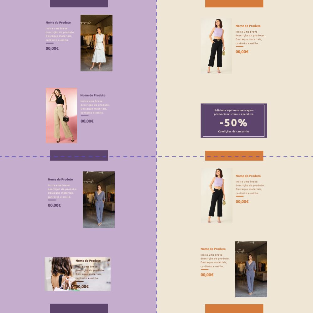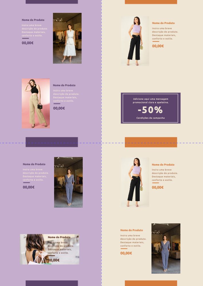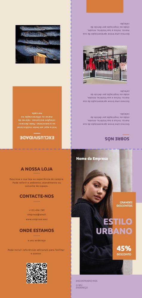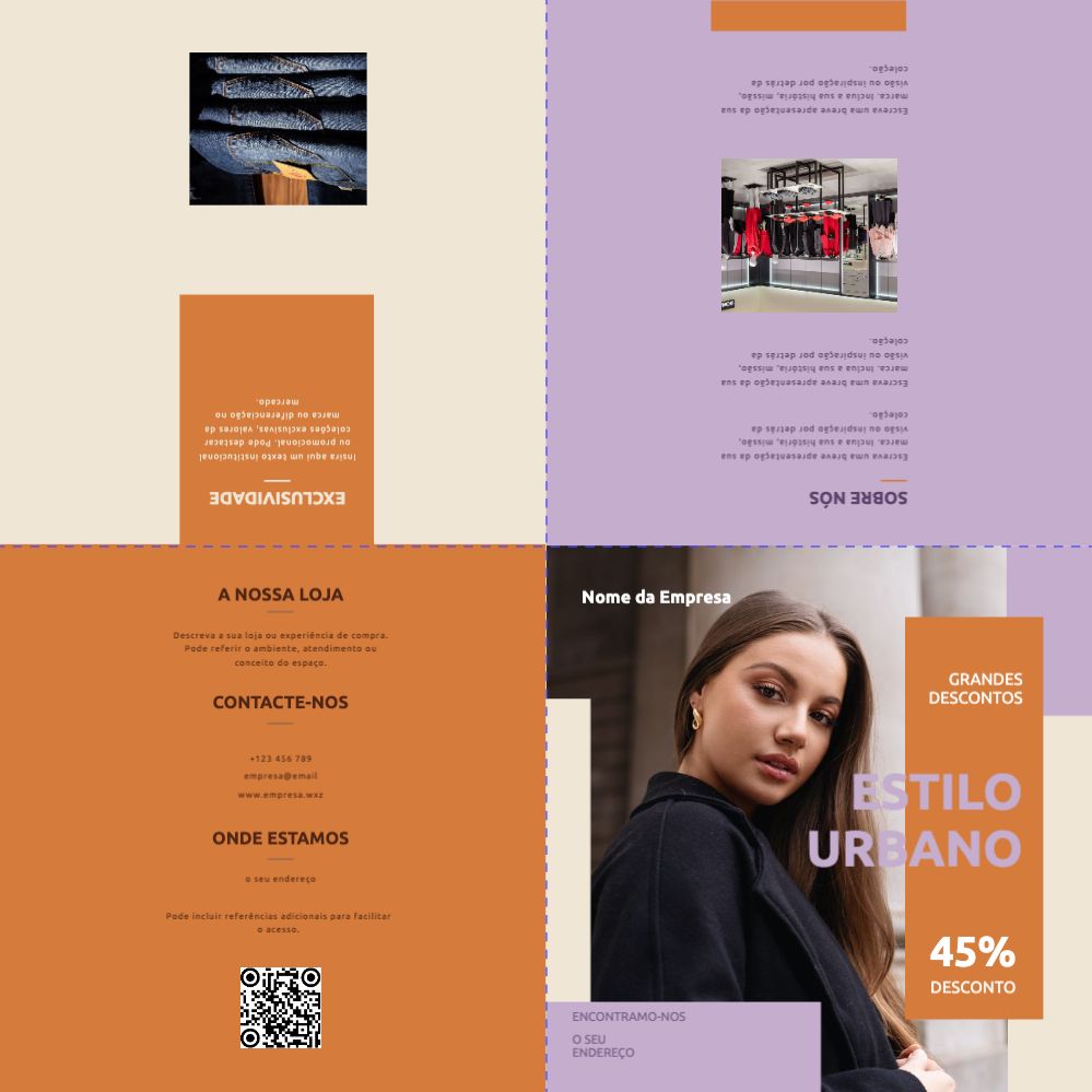 Explore diferentes estilos e modelos de folhetos com 2 dobras cruzadas. Escolha o design que melhor representa o seu negócio e personalize-o facilmente no nosso editor de design online.